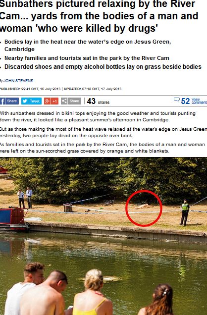 Απολαμβάνουν με τα μαγιό τους την ηλιόλουστη ημέρα δίπλα στο ποτάμι, στο Κέμπριτζ της Βρετανίας, όταν στην απέναντι όχθη κείτονται οι σοροί δύο τοξικομανών.