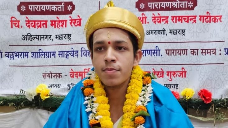 A rare achievement by the young vedamurti Devvrat Mahesh Rekhe (19yrs). Son of Vedabrahmasri Mahesh Chandrakant Rekhe of Ahilya nagar (MH), vedamurti Devvrat completed reciting nearly 2000 mantras of Shukla Yajurveda Madhyandina Shakha, (dandakrama parayanam) and thus cleared the… pic.twitter.com/ma5VieJQmL