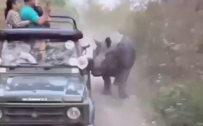 Συγκλονιστικά πλάνα κατέγραψαν τη στιγμή που ένας εξαγριωμένος ρινόκερος καταδίωξε δύο τζιπ γεμάτα τουρίστες που έκαναν σαφάρι, προσπαθώντας μάλιστα να τα ανατρέψει.