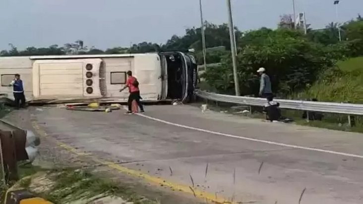 Ο οδηγός έχασε τον έλεγχο του οχήματος σε μια απότομη στροφή, με αποτέλεσμα το λεωφορείο να προσκρούσει σε προστατευτική μπαριέρα και να ανατραπεί, λίγα χιλιόμετρα μακριά από την πόλη Περουακάρτα.