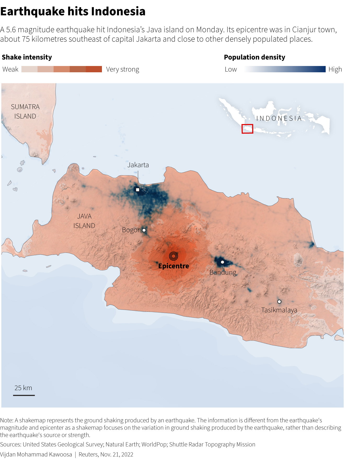Και ενώ η γη συνεχίζει να σείεται από τους ισχυρούς μετασεισμούς, οι αρχές ανακοίνωσαν ότι το επίκεντρο του σεισμού ήταν κοντά στην πόλη Cianjur στην ορεινή Δυτική Ιάβα, περίπου 75 χιλιόμετρα (45 μίλια) νοτιοανατολικά της πρωτεύουσας, Τζακάρτα. Στην περιοχή οι κάτοικοι ξεπερνούν τα 2,5 εκατομμύρια ανθρώπους. Ο κυβερνήτης της Δυτικής Ιάβας Ridwan Kamil δήλωσε στο Instagram ότι 162 άνθρωποι σκοτώθηκαν και 326 τραυματίστηκαν.
