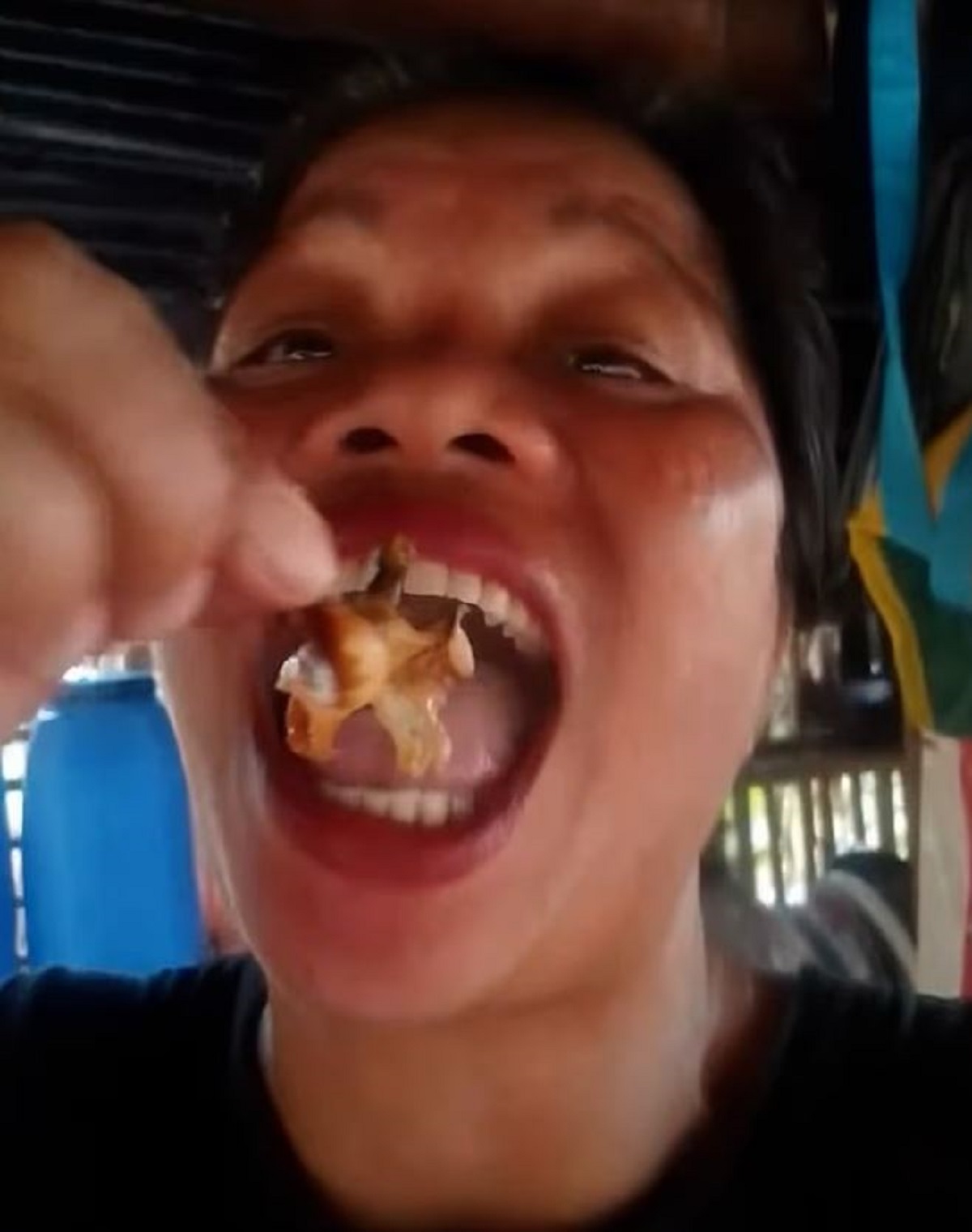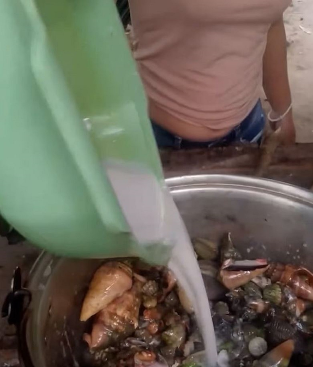 Φαίνεται επίσης να μαγειρεύει τα θαλασσινά σε μεγάλη κατσαρόλα με γάλα καρύδας και να δοκιμάζει σαλιγκάρι της θάλασσας μπροστά στην κάμερα.