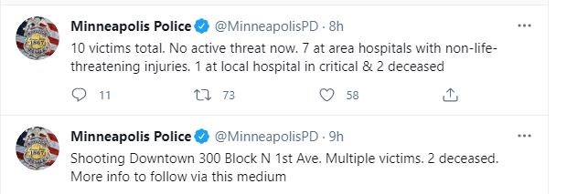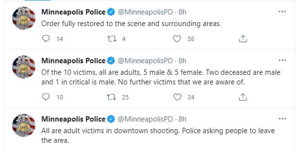Δύο άνθρωποι σκοτώθηκαν και οκτώ τραυματίστηκαν από πυροβολισμούς στο κέντρο της Μινεάπολης, σύμφωνα με ανακοίνωση από την αστυνομία. Σε σειρά αναρτήσεων στον λογαριασμό της στο twitter η αστυνομία της Μινεάπολης ενημέρωσε πως “από τους δέκα ανθρώπους που δέχθηκαν τους πυροβολισμούς, οι πέντε είναι άνδρες και οι πέντε είναι γυναίκες. Δύο από τους άνδρες πέθαναν και άλλος ένας άνδρας νοσηλεύεται σε κρίσιμη κατάσταση. Οι υπόλοιποι επτά φέρουν τραύματα που δεν κρίνονται απειλητικά για τη ζωή τους” αναφέρεται μεταξύ άλλων στις αναρτήσεις, ενώ σε άλλη προστίθεται πως “η τάξη αποκαταστάθηκε πλήρως στο σημείο και στις γύρω περιοχές”.