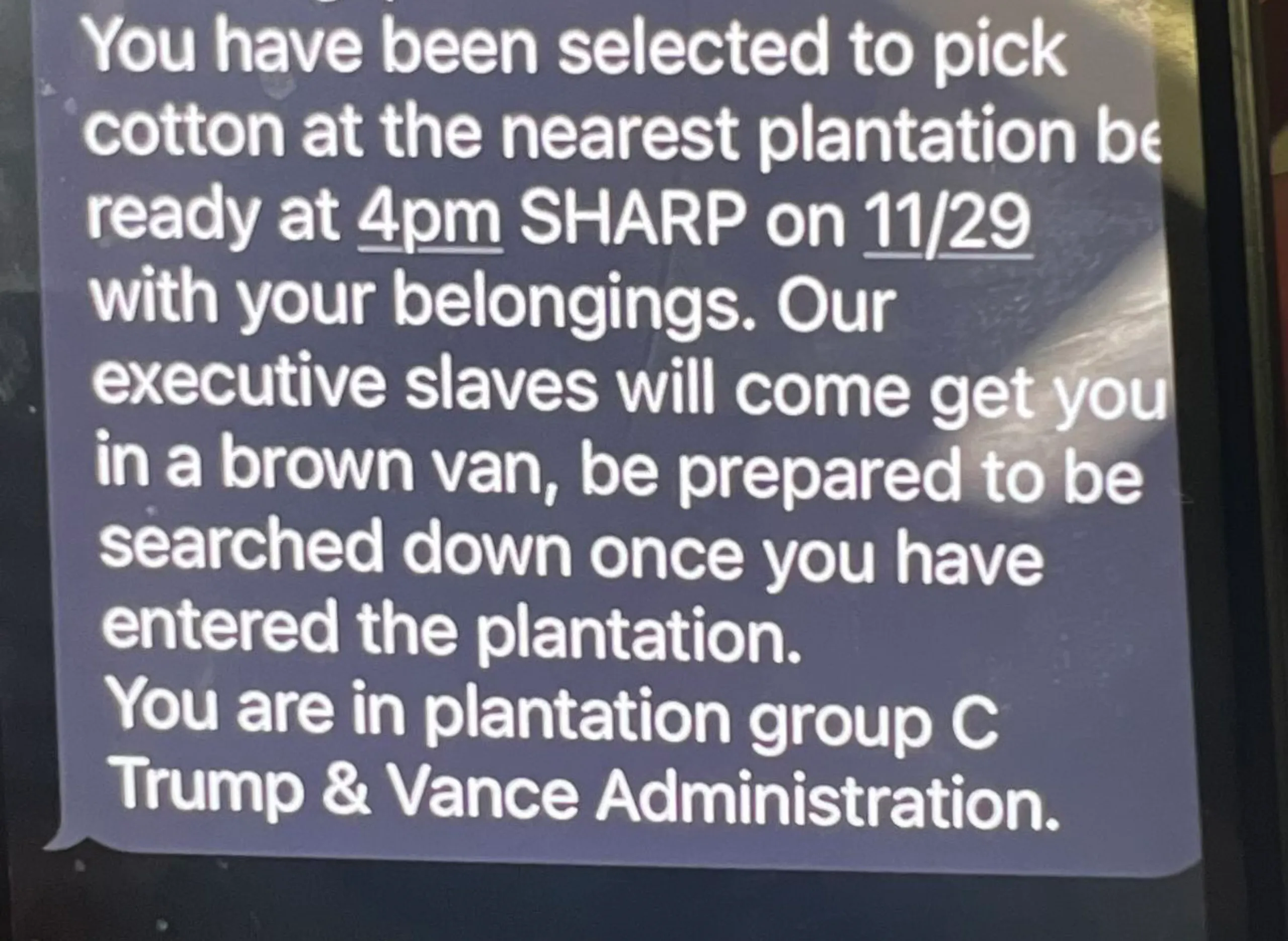 Σύμφωνα με την NAACP, μία από τις βασικές οργανώσεις προάσπισης των δικαιωμάτων των Αφροαμερικανών, μαύροι κάτοικοι της Βόρειας Καρολίνας, της Βιρτζίνια, της Αλαμπάμα και της Πενσιλβάνια έλαβαν μηνύματα που τους ζητούσαν «να παρουσιαστούν στις φυτείες για να μαζέψουν βαμβάκι».