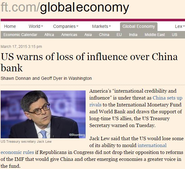 Πριν μερικές ημέρες η Γερμανία, η Γαλλία, η Ιταλία, και νωρίτερα η Βρετανία αποφάσισαν να συμμετάσχουν ως ιδρυτικά μέλη στην κινεζικής επιρροής αναπτυξιακή τράπεζα, Asian Infrastructure Investment Bank (AIIB), προκαλώντας εκνευρισμό στις ΗΠΑ στη σκιά του “νομισματικού πολέμου” διεθνώς. Οι ΗΠΑ αντιμετωπίζουν την ΑΙΙΒ ως βασικό αντίπαλο της Παγκόσμιας Τράπεζας και του Διεθνούς Νομισματικού Ταμείου, όπως σημειώνει σχετικό δημοσίευμα στην εφημερίδα Financial Times (17/3).