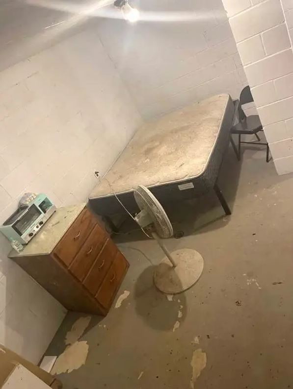 Μια φωτογραφία που δημοσίευσε το γραφείο του σερίφη δείχνει το εσωτερικό του καταφυγίου: ένα λεκιασμένο στρώμα σε μια γωνία, μια μαύρη μεταλλική πτυσσόμενη καρέκλα δίπλα του, έναν βρώμικο λευκό ανεμιστήρα με βάθρο και μια μόνο λάμπα που κρέμεται από την οροφή.
