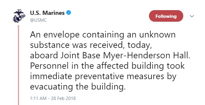 Ένας φάκελος που περιείχε άγνωστη ουσία ανοίχθηκε την Τρίτη σε στρατιωτική βάση κοντά στην Ουάσινγκτον με αποτέλεσμα να αρρωστήσουν 11 πεζοναύτες. Το περιστατικό συνέβη σε κτίριο της βάσης Μάιερ-Χέντερσον Χολ, το οποίοι εκκενώθηκε, ανακοίνωσε το σώμα Πεζοναυτών μέσω Twitter.