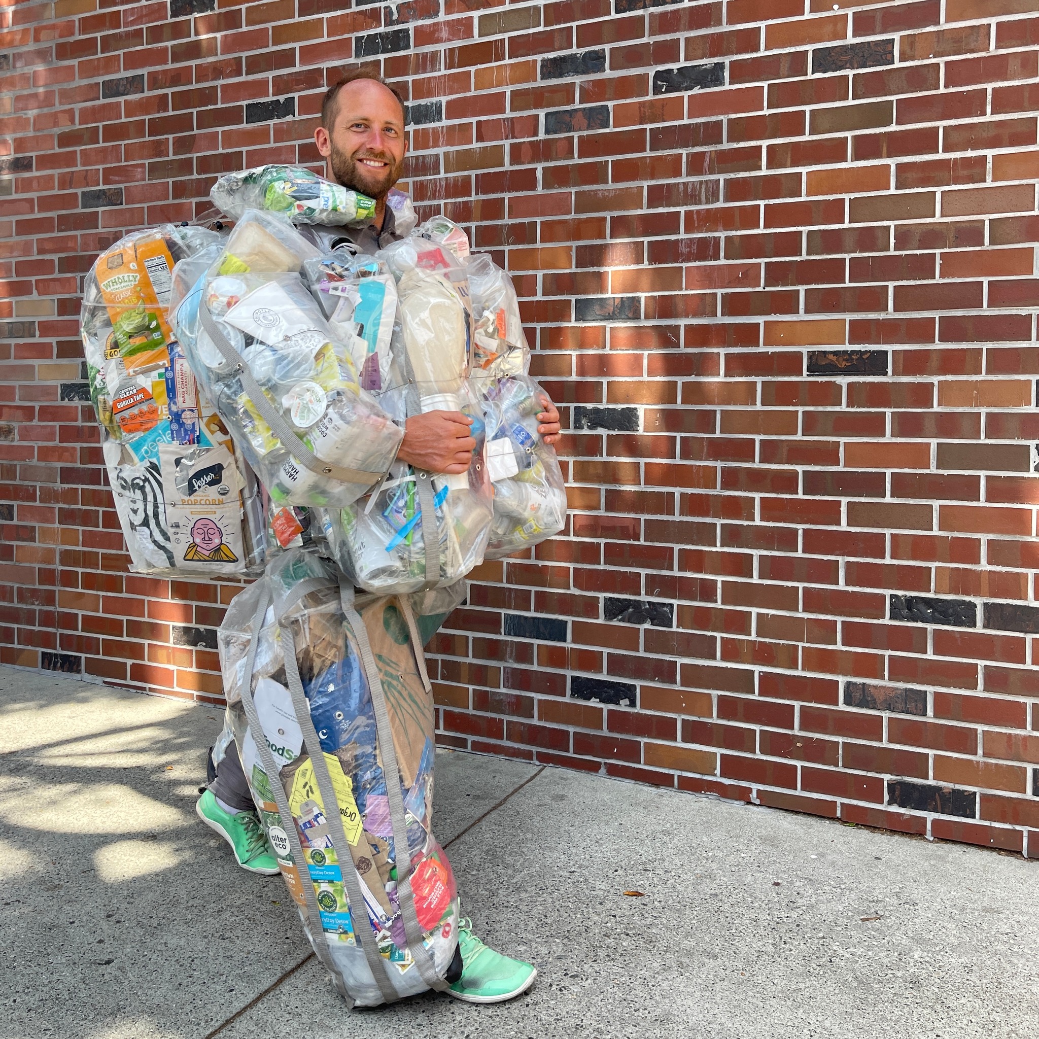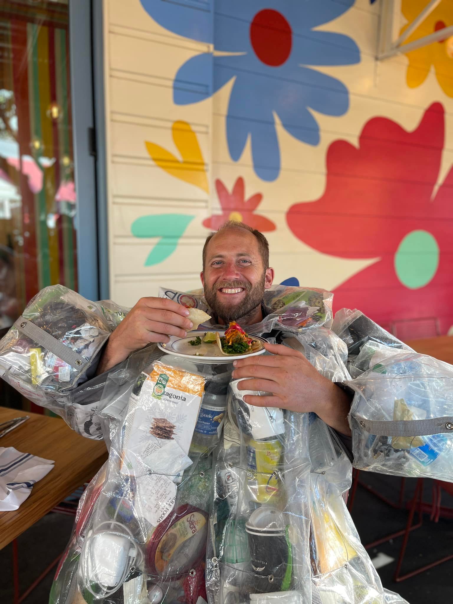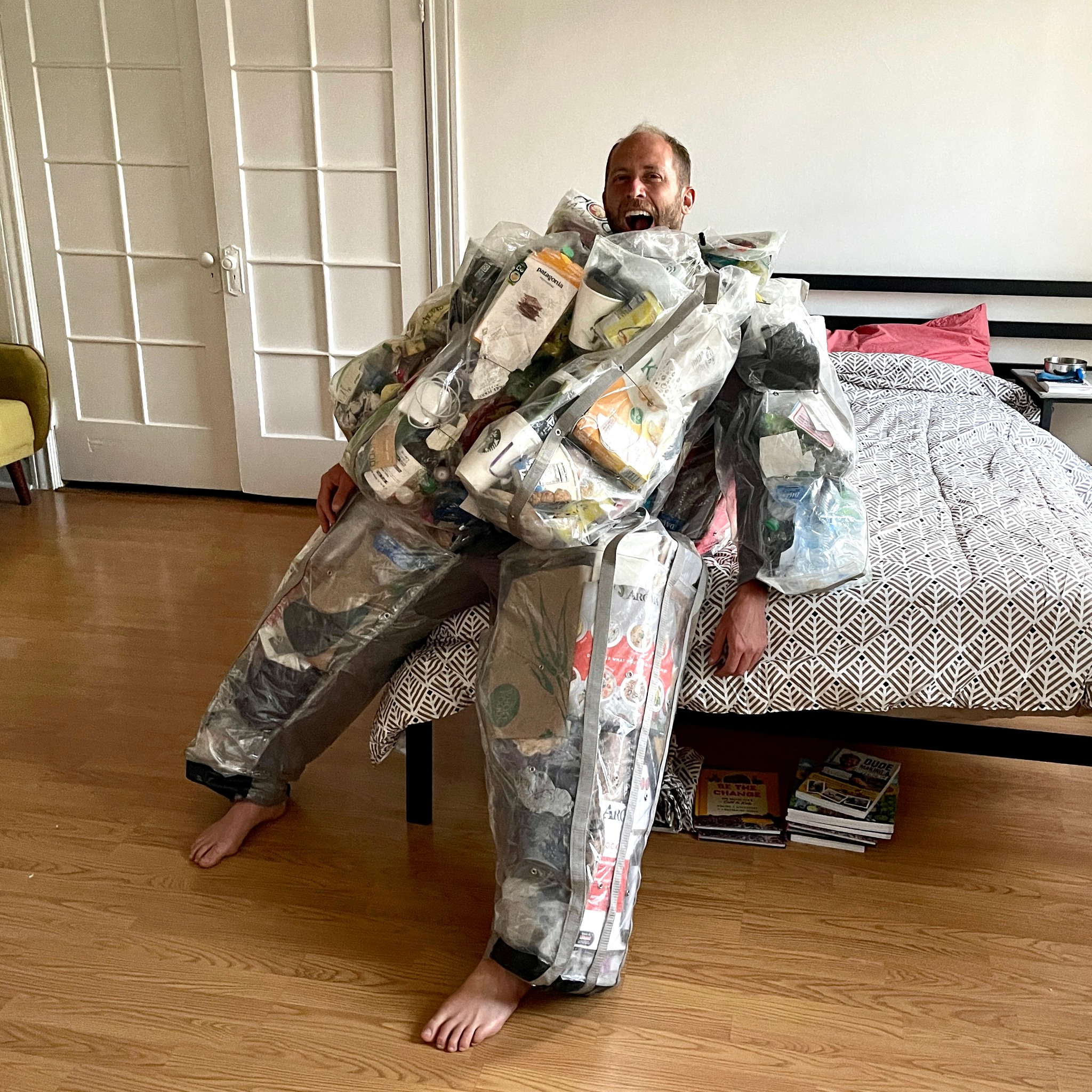 Με περίπου 30 κιλά σκουπίδια πάνω του περιδιαβαίνει τους δρόμους του Μπέβερλι Χιλς, με τα πολυτελή καταστήματα και τις πανάκριβες μπουτίκ, με στόχο να ευαισθητοποιήσει τον κόσμο κατά της υπερκατανάλωσης.