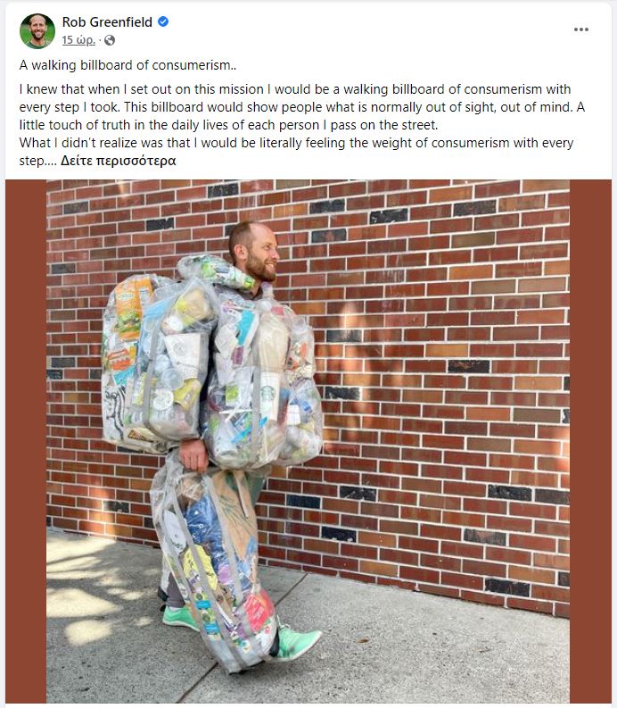 Ο οικολόγος ακτιβιστής Ρομπ Γκρίνφιλντ έχει τοποθετήσει σχολαστικά στη στολή του από διάφανο πλαστικό σχεδόν 30 κιλά σκουπίδια με τα οποία περπατά στους δρόμους του Λος Άντζελες από τότε που ξεκίνησε την υλοποίηση του σχεδίου του.