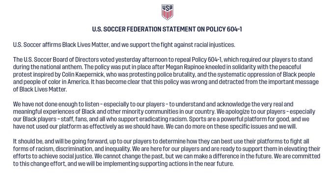 Η ποδοσφαιρική Ομοσπονδία των ΗΠΑ (USSF) κατήργησε τον κανόνα 604-1, που απαγόρευε στα μέλη Εθνικών ομάδων να γονατίζουν κατά τη διάρκεια του ύμνου των Ηνωμένων Πολιτειών, ως ένδειξη υποστήριξης για τη μαύρη κοινότητα και κατά του ρατσισμού. Ήταν ένα μέτρο που είχε εισαχθεί το 2017, αφού η σταρ της παγκόσμιας πρωταθλήτριας ομάδας των ΗΠΑ, Μέγκαν Ράπινο, είχε γονατίσει κατά τη διάρκεια διεθνούς αναμέτρησης.
