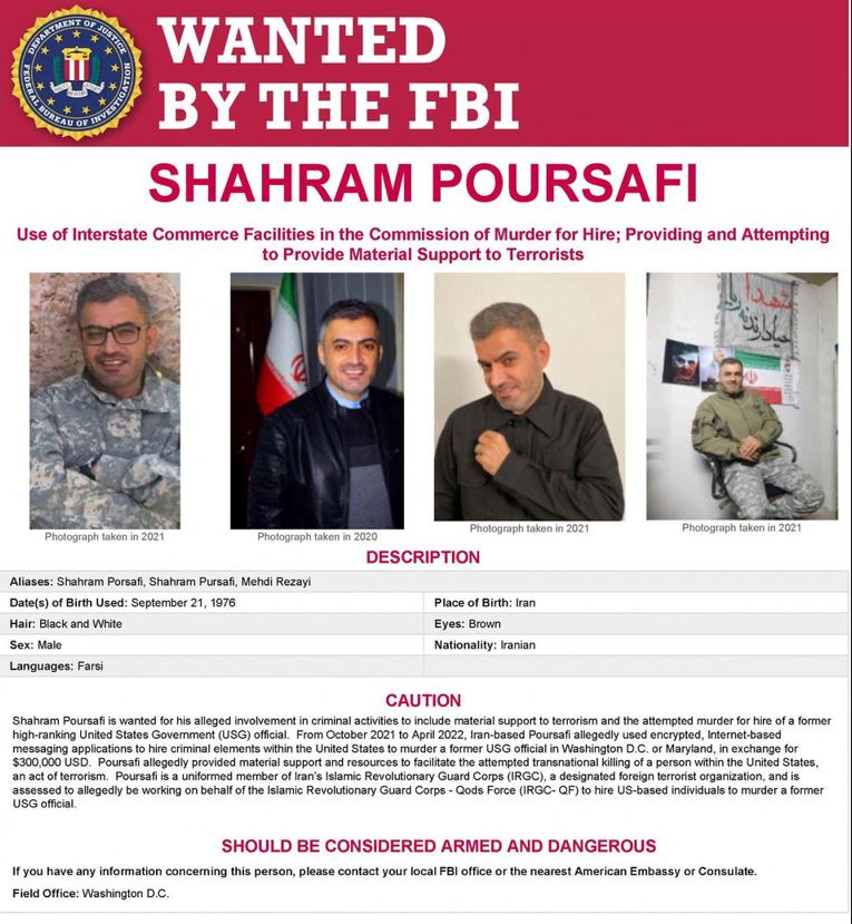 Το FBI εξέδωσε ένταλμα σύλληψης για τον Πουρσαφί με φωτογραφίες, δυο εκ των οποίων τον δείχνουν να φορά τη στολή των Φρουρών της Επανάστασης.