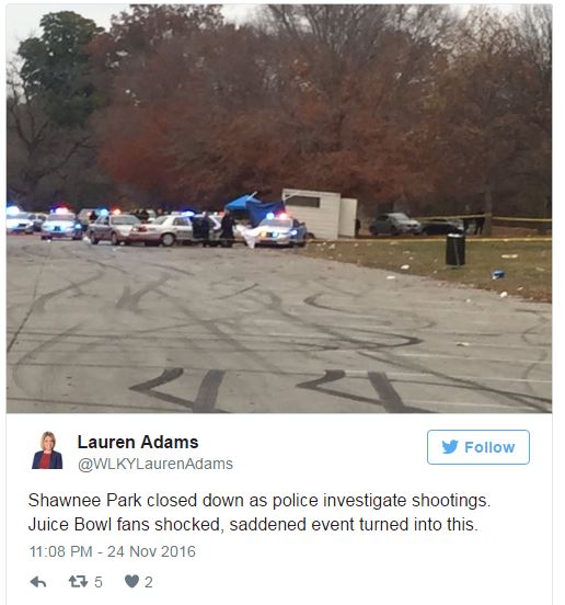 Δύο άνθρωποι έχασαν τη ζωή τους στο Λούισβιλ του Κεντάκυ, όταν άγνωστος άρχισε να πυροβολεί εναντίον οικογενειών που είχαν συγκεντρωθεί σε πάρκο για να παρακολουθήσουν τουρνουά αγώνων αμερικανικού ποδοσφαίρου που διοργανώνεται κάθε χρόνο την Ημέρα των Ευχαριστιών.