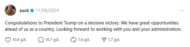 Επιπλέον, ο Ζούκεμπεργκ ήταν μεταξύ των ηγετών της τεχνολογίας που έσπευσαν να συγχαρούν δημόσια τον Τραμπ μετά τις εκλογές του Νοεμβρίου, φανερώνοντας μια διάθεση συνεργασίας για τα χρόνια που έρχονται.