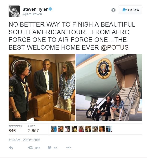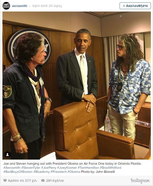 Όταν ο Μπάρακ Ομπάμα έμαθε ότι ο Στιβ Τάιλερ και η παρέα του βρίσκονταν εκεί τριγύρω δεν έχασε ευκαιρία και τους προσκάλεσε στο Air Force One.