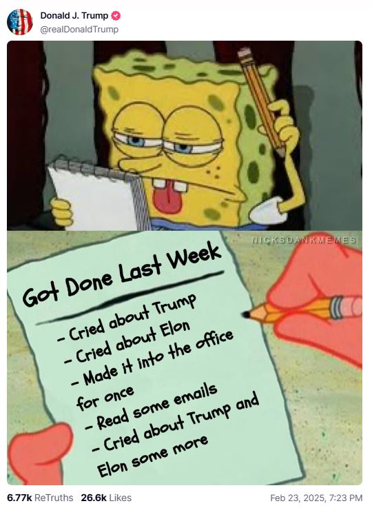 Ο Τραμπ δημοσίευσε ένα meme που δείχνει τον αγαπημένο χαρακτήρα του Μπομπ Σφουγγαράκη, κρατώντας ένα μπλοκ σημειώσεων και ένα μολύβι, να σκέφτεται σοβαρά, ενώ η δεύτερη σελίδα του μπλοκ, που κρατούσε ο φίλος του Μπόμπ, Πάτρικ ο Αστερίας, έδειχνε μια επεξεργασμένη λίστα με τίτλο «Έκανα την προηγούμενη εβδομάδα».