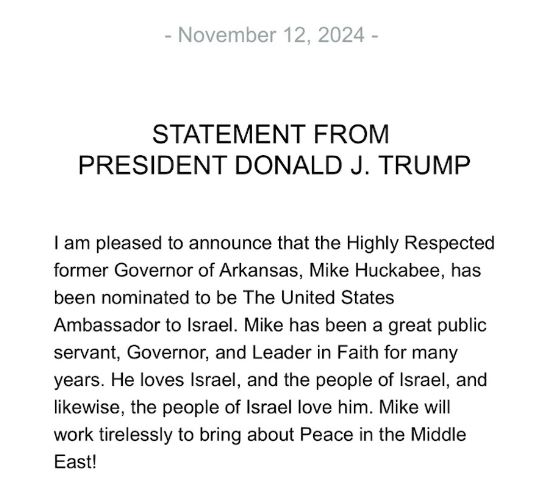 «Αγαπά το Ισραήλ και τον λαό του Ισραήλ και ομοίως, ο λαός του Ισραήλ τον αγαπά. Ο Μάικ θα εργαστεί άοκνα για να επιστρέψει η ειρήνη στη Μέση Ανατολή!», ανέφερε μέσω Truth Social ο Ρεπουμπλικάνος εκλεγμένος αρχηγός του κράτους, ο οποίος το 2018 αποφάσισε να μεταφερθεί η αμερικανική πρεσβεία στο Ισραήλ από το Τελ Αβίβ στην Ιερουσαλήμ.