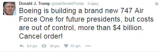 “Η κοστολόγηση των Boeing 747 Air Force One είναι εκτός ελέγχου κατά τουλάχιστον 4 δισεκατομμύρια δολάρια. Ακυρώστε την παραγγελία” τόνισε ο Ντόναλντ Τραμπ με ανάρτηση του στο Twitter.