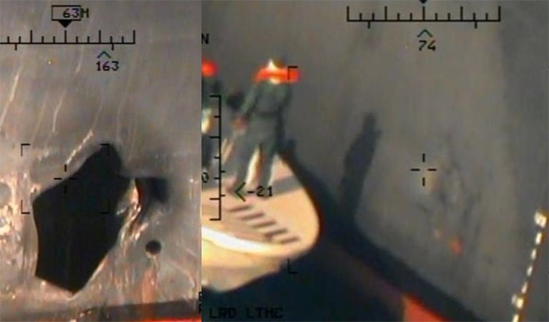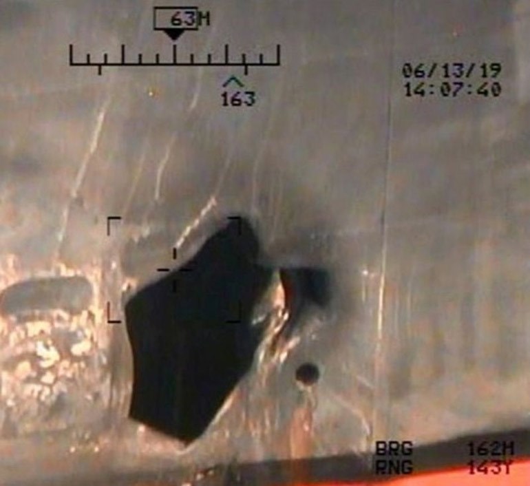 Άλλη φωτογραφία εικονίζει την κοιλότητα που άνοιξε άλλη νάρκη στο κύτος του ίδιου δεξαμενόπλοιου, η οποία κατά το Πεντάγωνο είχε διάμετρο μεγαλύτερη του ενός μέτρου.