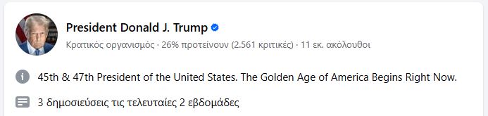Αξιοσημείωτο είναι ότι, τη Δευτέρα, ο λογαριασμός του Τραμπ στην πλατφόρμα Facebook είχε ακριβώς 11 εκατομμύρια ακολούθους, τον ίδιο αριθμό με τον λογαριασμό του πρώην προέδρου Τζο Μπάιντεν.