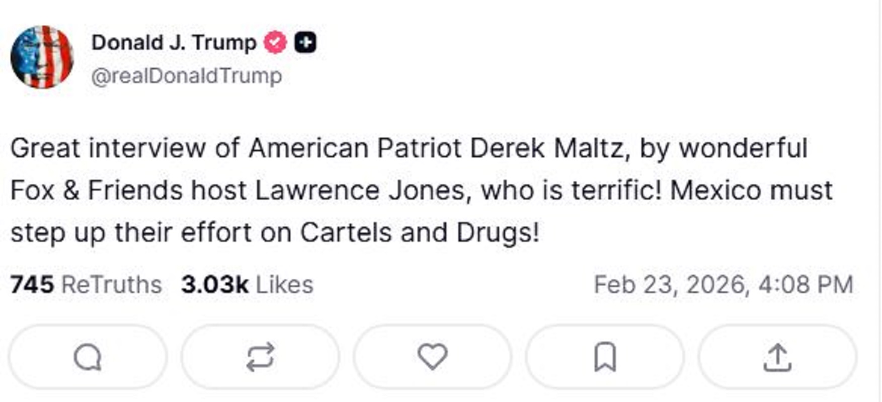 «Εξαιρετική συνέντευξη του Αμερικανού πατριώτη Ντέρεκ Μαλτζ, από τον υπέροχο παρουσιαστή του Fox & Friends, Λόρενς Τζόουνς, που είναι καταπληκτικός! Το Μεξικό πρέπει να εντείνει τις προσπάθειές του κατά των καρτέλ και των ναρκωτικών!», έγραψε χαρακτηριστικά.