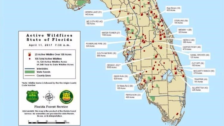 Σύμφωνα με τις τοπικές αρχές, 105 πυρκαγιές έχουν εκδηλωθεί σε όλη την Πολιτεία και οι 23 από αυτές είναι μεγάλες. Από τον Ιανουάριο έχουν καεί 280.000 στρέμματα στη Φλόριντα.