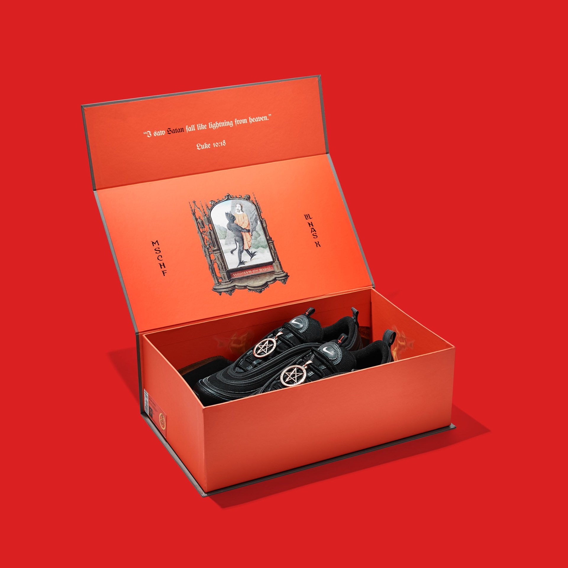 Τα 666 ζευγάρια, τα οποία πωλούνταν έναντι 1.018 δολαρίων, κυκλοφόρησαν τη Δευτέρα και εξαντλήθηκαν μέσα σε λίγα λεπτά. Το συγκεκριμένο ζευγάρι είναι μετατροπή των Nike Air Max 97s, και έχει ανάποδο σταυρό, πεντάλφα στα κορδόνια και στο εσωτερικό τους, και τις λέξεις “ΛΟΥΚΑΣ 10:18”, οι οποίες είναι αναφορά σε εδάφιο από το Κατά Λουκάν Ευαγγέλιο, στο οποίο ο Ιησούς λέει «Είδα τον Σατανά να πέφτει ως κεραυνός από τον Παράδεισο».