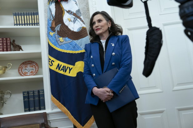 Η φωτογραφία, που απαθανάτισε ο φακός των New York Times, δείχνει την Κυβερνήτη του Μίσιγκαν και πιθανή υποψήφια των Δημοκρατικών για την προεδρία το 2028 να καλύπτει προσωρινά το πρόσωπό της με έναν φάκελο κατά τη διάρκεια της επίσκεψής της στο Οβάλ Γραφείο, ενώ στεκόταν δίπλα στον πρόεδρο Ντόναλντ Τραμπ.