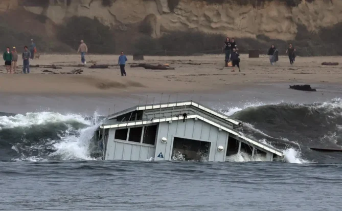 That chunk of the Santa Cruz wharf that partially collapsed this week is now sitting on the beach. People are spending Christmas day exploring the restroom building. pic.twitter.com/XdvGcFjPFo