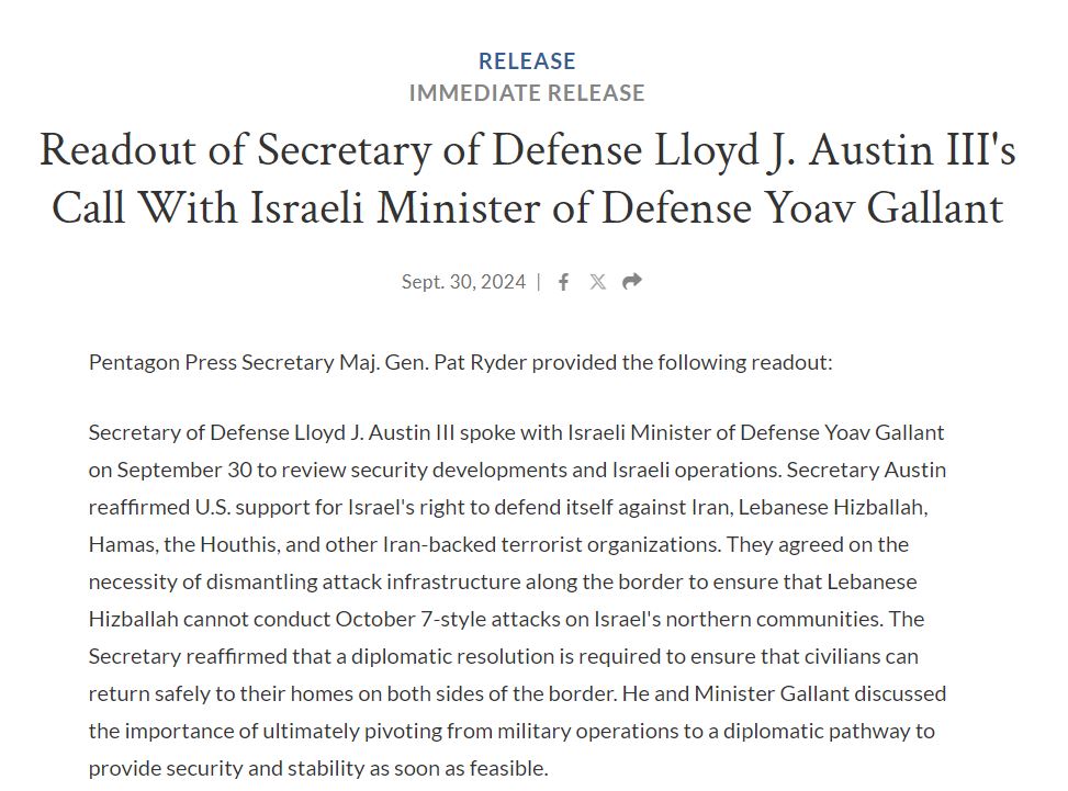 Ο υπουργός Άμυνας των ΗΠΑ, Λόιντ Όστιν, εξέφρασε την πεποίθησή του, όπως και ο Ισραηλινός ομόλογός του, Γιοάβ Γκάλαντ, για την «αναγκαιότητα» της «καταστροφής των υποδομών επίθεσης» της Χεζμπολάχ. Την ίδια στιγμή, οι ισραηλινές ένοπλες δυνάμεις επιβεβαίωσαν κατά τη διάρκεια της νύχτας ότι πραγματοποιούν χερσαίες επιχειρήσεις στο νότιο Λίβανο εναντίον του σιιτικού κινήματος.