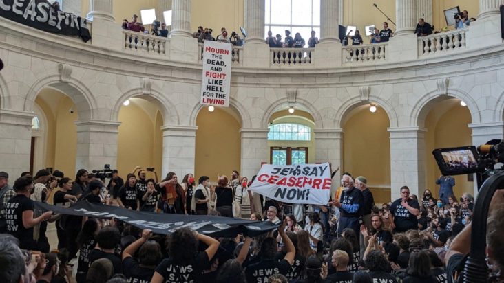 Στη διαμαρτυρία είχαν καλέσει οι οργανώσεις Jewish Voice for Peace και If Not Now που είναι υπέρ της ελεύθερης Παλαιστίνης.