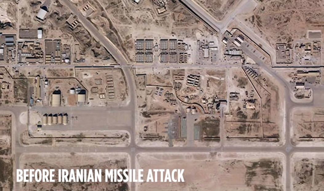 Μία από τις εικόνες που δημοσιεύθηκε από το Planet Labs Inc. και δείχνει τις πέντε περιοχές που υπέστησαν τις μεγαλύτερες καταστροφές στη βάση Ain al-Assad, η οποία χτυπήθηκε από 10 βαλλιστικούς πυραύλους.