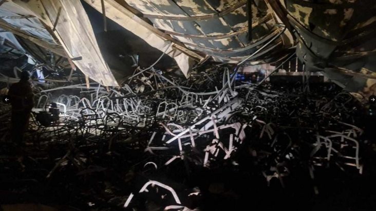 Η υπηρεσία Πολιτικής Προστασίας υπογραμμίζει σε ανακοίνωσή της πως «η φωτιά προκάλεσε την κατάρρευση τμήματος της οροφής, λόγω των ιδιαίτερα εύφλεκτων και φθηνών δομικών υλικών». «Μαρτυρίες αναφέρουν τη ρίψη πυροτεχνημάτων στη διάρκεια της γαμήλιας δεξίωσης, τα οποία προκάλεσαν την πυρκαγιά», συμπληρώνει.