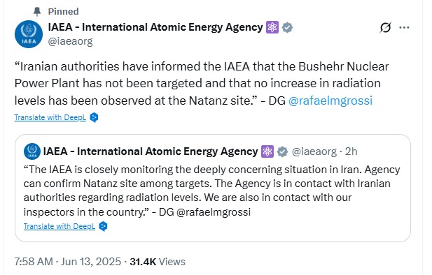 Ο Διεθνής Οργανισμός Ατομικής Ενέργειας με ανάρτηση στο Χ ανέφερε ότι «παρακολουθεί στενά τη βαθιά ανησυχητική κατάσταση στο Ιράν».