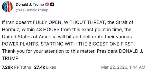 «Εάν το Ιράν δεν ανοίξει πλήρως, χωρίς απειλές, τα Στενά του Ορμούζ, εντός 48 ωρών από αυτήν ακριβώς τη χρονική στιγμή, οι ΗΠΑ θα πλήξουν και θα εξαφανίσουν τους διάφορους σταθμούς παραγωγής ενέργειάς τους».