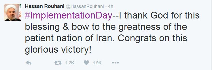 “Ευχαριστώ τον Θεό για την ευλογία του και υποκλίνομαι στο μεγαλείο των πολιτών του Ιράν για την υπομονή που επέδειξαν. Συγχαρητήρια για αυτή τη μεγαλειώδη νίκη”, ανέφερε με ανάρτηση του στο twitter o Ροχανί.