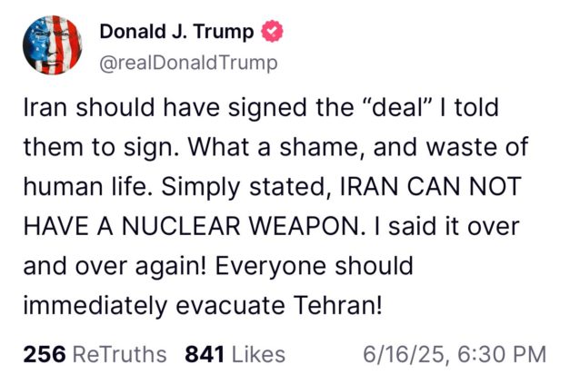 Η κλιμάκωση των επιδρομών στην Τεχεράνη έρχεται μετά την ανάρτηση του προέδρου των ΗΠΑ, Ντόναλντ Τραμπ, στην οποία κάλεσε τους κατοίκους της πρωτεύουσας του Ιράν να εκκενώσουν την πόλη.