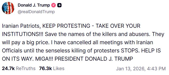Καθώς ο απολογισμός μεγάλωνε την Τρίτη, ο πρόεδρος των ΗΠΑ, Ντόναλντ Τραμπ, έγραψε στην πλατφόρμα Truth Social: «Ιρανοί πατριώτες, συνεχίστε να διαδηλώνετε – καταλάβετετους θεσμούς σας!».