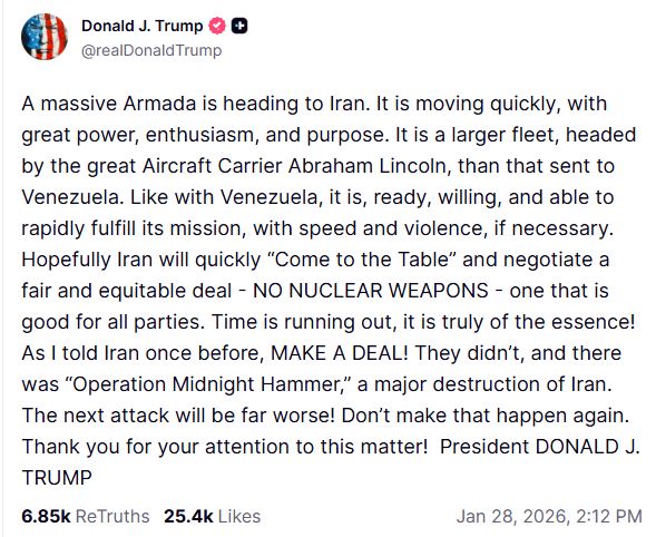 Ο Πρόεδρος των ΗΠΑ δεν έδωσε λεπτομέρειες για τη συμφωνία που απαιτεί, λέγοντας μόνο ότι μια «τεράστια αρμάδα» κατευθύνεται προς το Ιράν και ότι η χώρα θα πρέπει να συνάψει συμφωνία.