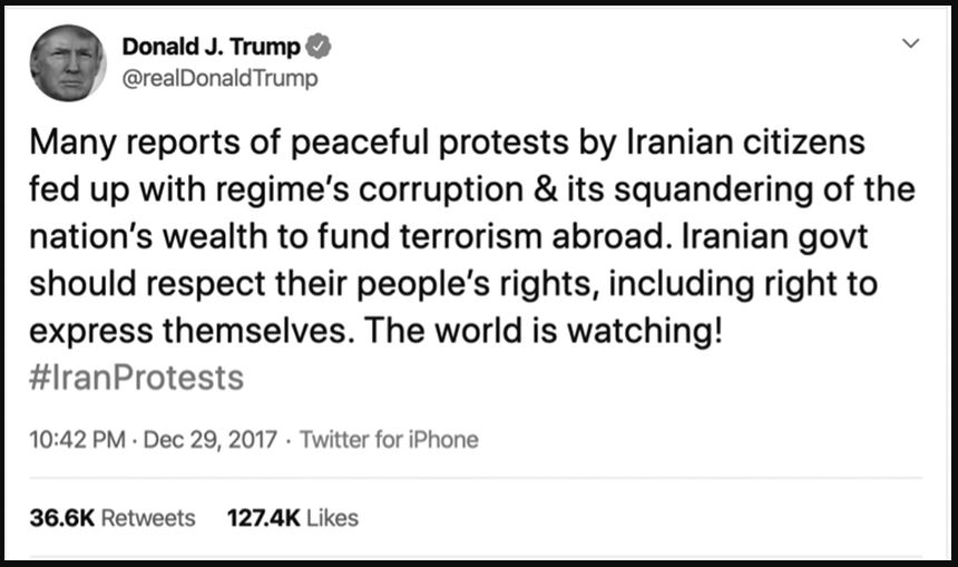 Το διαδικτυακό μήνυμα του Τραμπ αποτέλεσε μια άμεση ένδειξη στήριξης προς τους διαδηλωτές, κάτι που άλλοι Αμερικανοί πρόεδροι απέφευγαν στο παρελθόν, φοβούμενοι ότι όσοι συμμετείχαν στις κινητοποιήσεις θα κατηγορούνταν πως συνεργάζονται με τη Δύση.