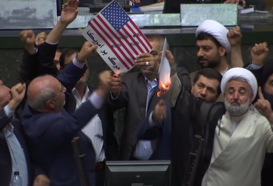 Ιρανοί βουλευτές έκαψαν χάρτινη αμερικανική σημαία και ένα αντίγραφο της συμφωνίας για το ιρανικό πυρηνικό πρόγραμμα στην έδρα του ιρανικού κοινοβουλίου, φωνάζοντας «θάνατος στην Αμερική» για να μην αφήσουν καμία αμφιβολία για το γεγονός ότι η αποχώρηση των ΗΠΑ από την συμφωνία ευνοεί πάνω από όλους τους Ιρανούς σκληροπυρηνικούς που ποτέ δεν ευνόησαν το καθεστώς που είχε διαμορφωθεί μετά το 2015 στις διεθνείς σχέσεις της χώρας τους.