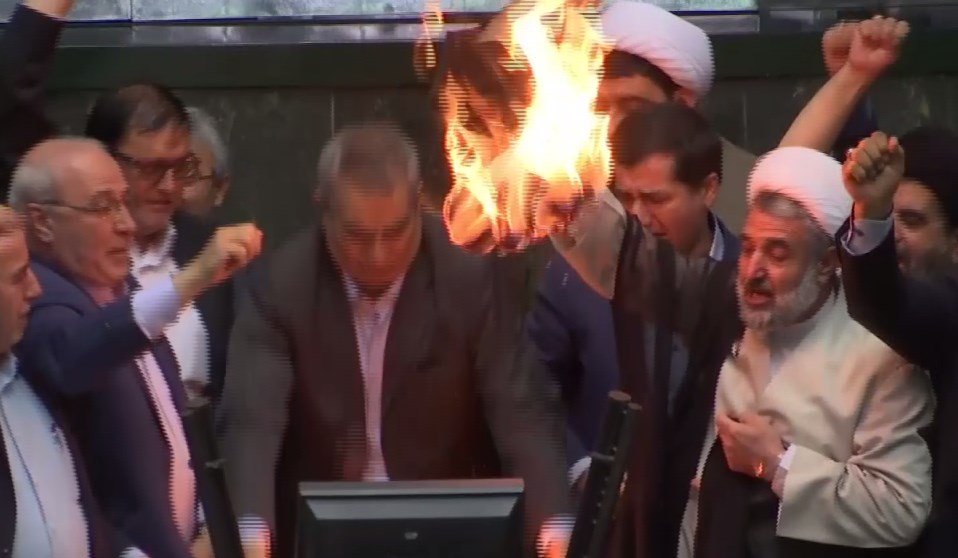 Ένας άλλος συντηρητικός βουλευτής, ο Μοζτάμπα Ζολνούρ, ανεβαίνει και εκείνος στη συνέχεια στο βήμα και βάζει φωτιά σε ένα αντίγραφο της διεθνούς συμφωνίας. «Κάψαμε την πυρηνική συμφωνία», φωνάζει.