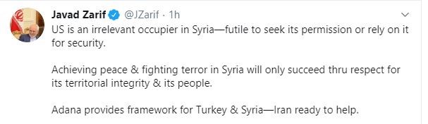 «Οι ΗΠΑ είναι ένας άνευ σημασίας κατακτητής στη Συρία – μάταιο να επιδιώξει κανείς την άδειά του ή να βασιστεί σε αυτόν για την ασφάλεια.Η επίτευξη ειρήνης και η καταπολέμηση της τρομοκρατίας στη Συρία θα γίνει μόνο μέσα από τον σεβασμό της εδαφικής της ακεραιότητας και του λαού της», τόνισε ο Ζαρίφ σε ανάρτησή του στο twitter.