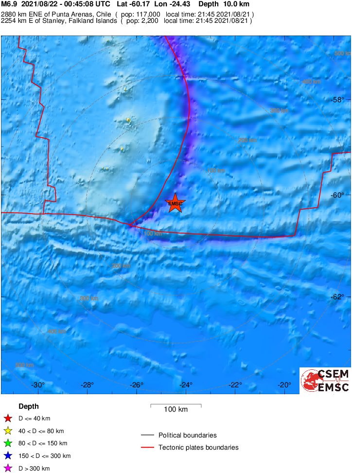 Ισχυρός σεισμός 6,9 βαθμών σημειώθηκε τα ξημερώματα της Κυριακής στην περιοχή των απομακρυσμένων Νήσων Νότιες Σάντουιτς, στον νότιο Ατλαντικό, ανακοίνωσε το αμερικανικό ινστιτούτο γεωλογικών μελετών (USGS). Το εστιακό βάθος του σεισμού υπολογίζεται στα 10 χιλιόμετρα, ανέφερε το ινστιτούτο. Κατά το Σύστημα Έγκαιρης Προειδοποίησης για Τσουνάμι των ΗΠΑ, δεν θεωρείται πως υπάρχει κίνδυνος εκδήλωσης τσουνάμι.