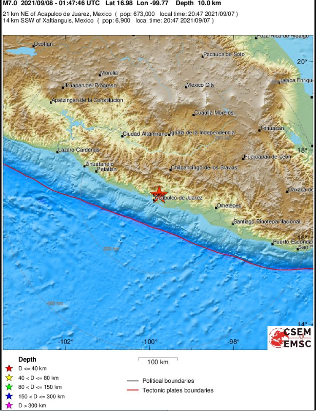 Το επίκεντρο του σεισμού εντοπίστηκε 14 χιλιόμετρα νοτιοανατολικά της πόλης Ακαπούλκο, στην πολιτεία Γκερέρο, 400 χιλιόμετρα νότια της πόλης του Μεξικού, διευκρίνισε το κέντρο.