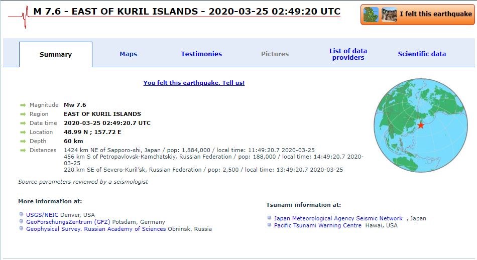 Ισχυρότατος σεισμός 7,6 Ρίχτερ σημειώθηκε στις 04:49 ώρα Ελλάδας σε θαλάσσια περιοχή στις Κουρίλες Νήσους, σύμφωνα με το Ευρωμεσογειακό Ινστιτούτο. Η δόνηση είχε εστιακό βάθος 60 χλμ και επίκεντρο που εντοπίζεται στα 1.424 χλμ βορειοανατολικά της πόλης Σαπόρο στην Ιαπωνία, σε θαλάσσιο χώρο και 220 χλμ. νοτιοανατολικά της πόλης της Ρωσίας Σεβέρο-Κουρίλσκ.Η δόνηση έγινε ιδιαίτερα αισθητή στην ευρύτερη περιοχή και σε αρκετά νησιά του Ειρηνικού Ωκεανού, ωστόσο μέχρι στιγμής δεν υπάρχουν αναφορές για τραυματισμούς η καταστροφές.