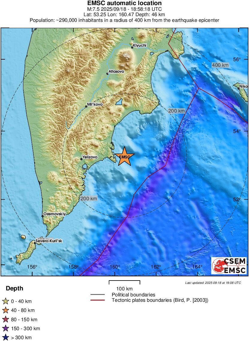 Ισχυρός σεισμός 7,8 βαθμών της κλίμακας Ρίχτερ σημειώθηκε πριν απο λίγο στη χερσόνησο Καμτσάτκα της Ρωσίας. Έχει εκδοθεί προειδοποίηση για τσουνάμι.