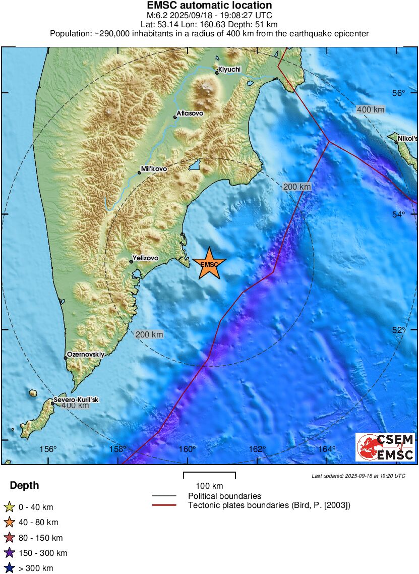 σύμφωνα με το Ευρωμεσογειακό Σεισμολογικό Κέντρο, το επίκεντρο του σεισμού εντοπίζεται 128 χλμ,. ανατολικά-βορειοανατολικά του Πετροπαβλόσκ-Καμτσάτσκι ενώ το εστιακό βάθος υπολιογιζεται στα 20 χλμ.