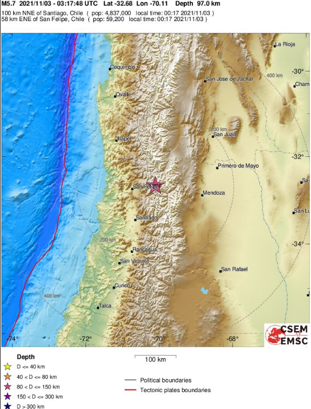 Η νεότερη ανάρτηση του Ευρωμεσογειακού Ινστιτούτου η οποία σημειώνει πως ο σεισμός ήταν 5,7 Ρίχτερ με το εστιακό βάθος να ορίζεται στα 97 χιλιόμετρα και το επίκεντρο στα 58 χιλιόμετρα από την πόλη Σαν Φελίπε της Χιλής