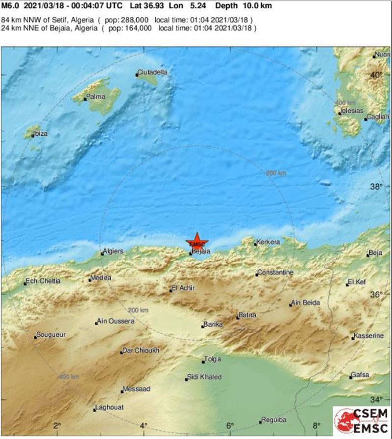 Ισχυρή σεισμική δόνηση 6 βαθμών της κλίμακας Ρίχτερ σημειώθηκε κατά τη διάρκεια της νύχτας στον θαλάσσιο χώρο ανοικτά της ανατολικής Αλγερίας, σύμφωνα με το Ευρωπαϊκό ινστιτούτο γεωφυσικών ερευνών.
