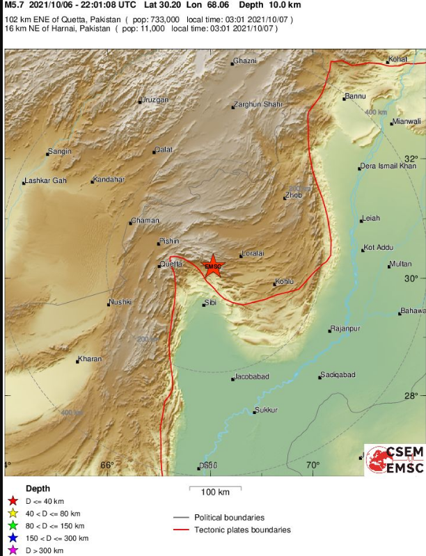 Ισχυρός σεισμός μεγέθους 5,7 βαθμών της κλίμακας Ρίχτερ σημειώθηκε στο Πακιστάν, μία ώρα μετά τα μεσάνυχτα (ώρα Ελλάδας) της Πέμπτης.